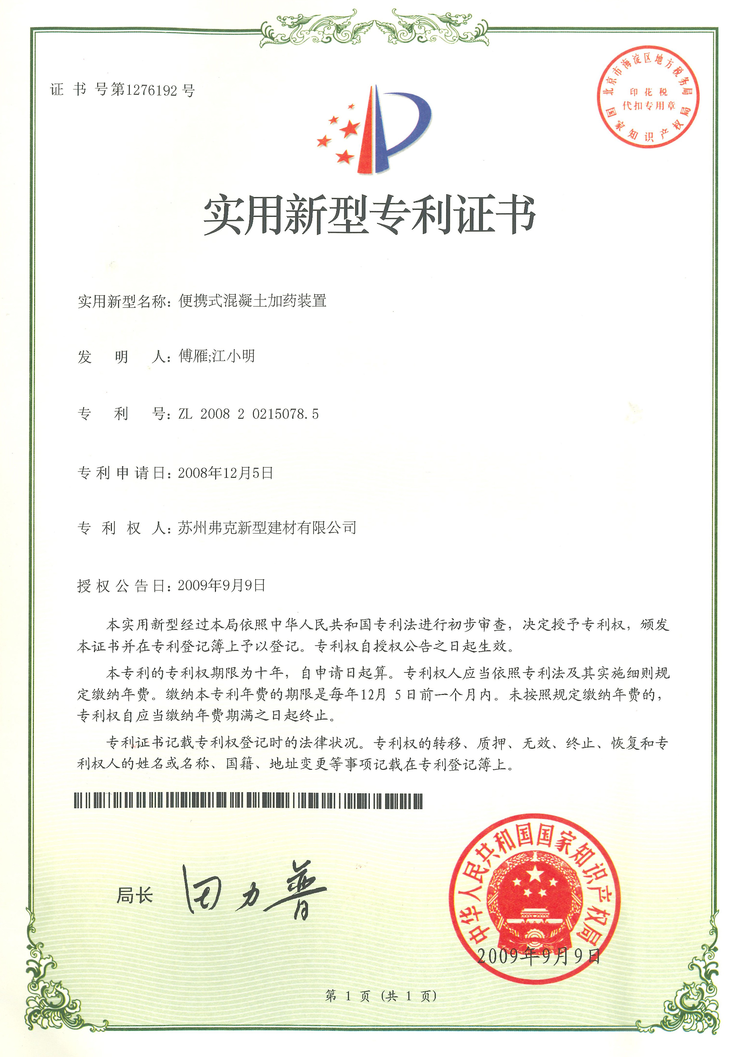 專利號:ZL 2008202150785